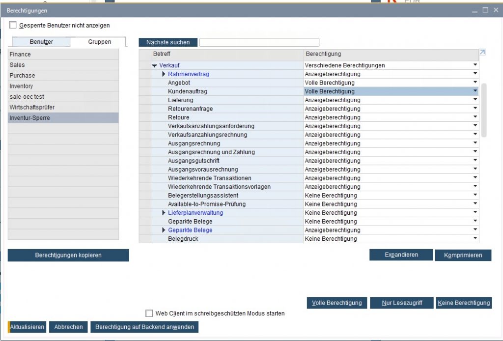 - Setzen Sie nun selektiv die Belege, die während der Inventur weiterhin erlaubt sein sollen, auf „Volle Berechtigung“